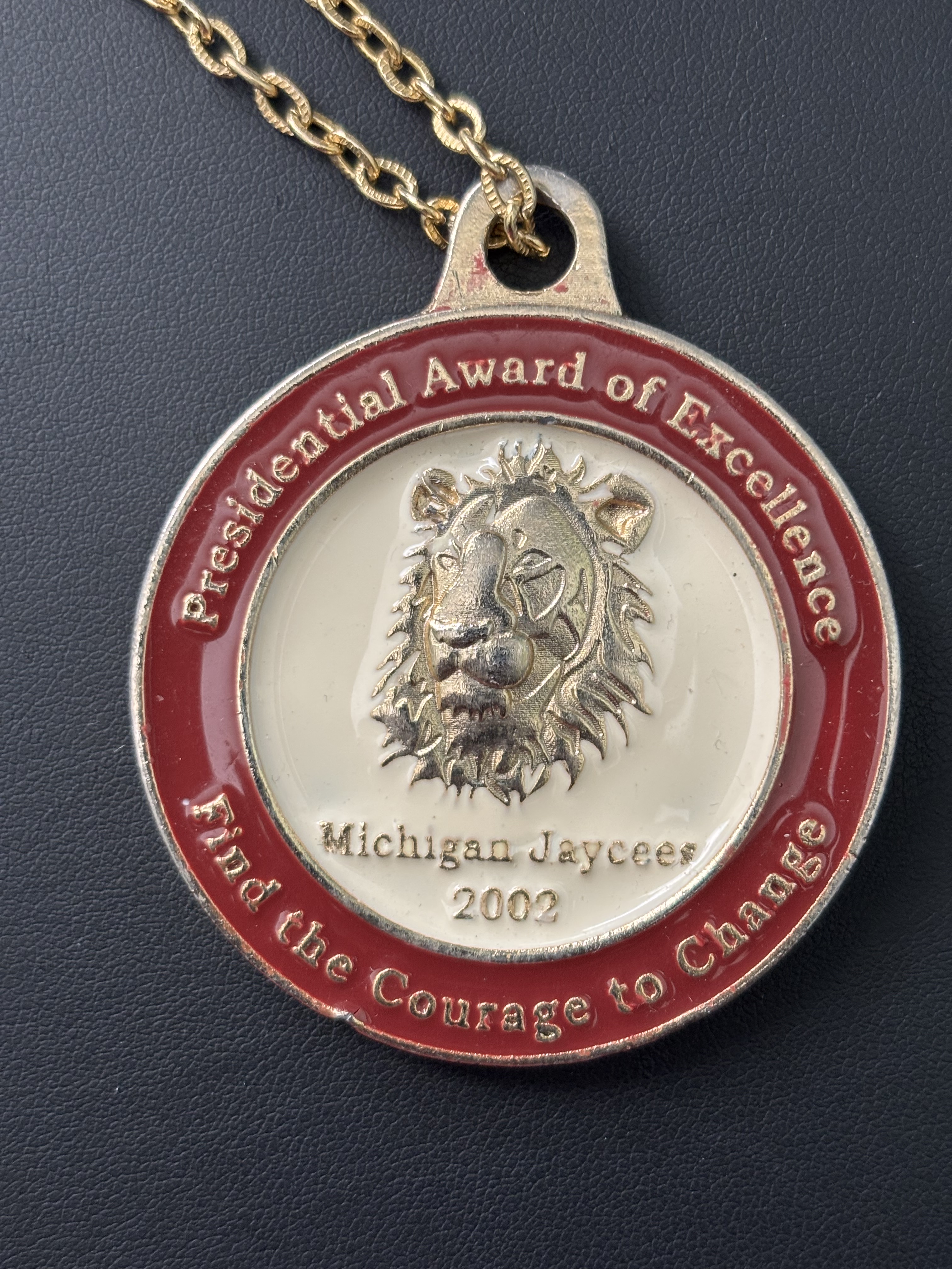 Now, there are lots of traditions within the Michigan Jaycees, ranging from the quarterly awards conventions held throughout the state with a traveling trophy passed from winning chapter to winning chapter, to the different cheers and themes used by chapter and state presidents to fire up their members, to the time when the major fundraisers for local chapters were the haunted houses and forests or other Halloween related events & historical tours. One of the most memorable traditions for those of us who served as state president are the Presidential Medallions.