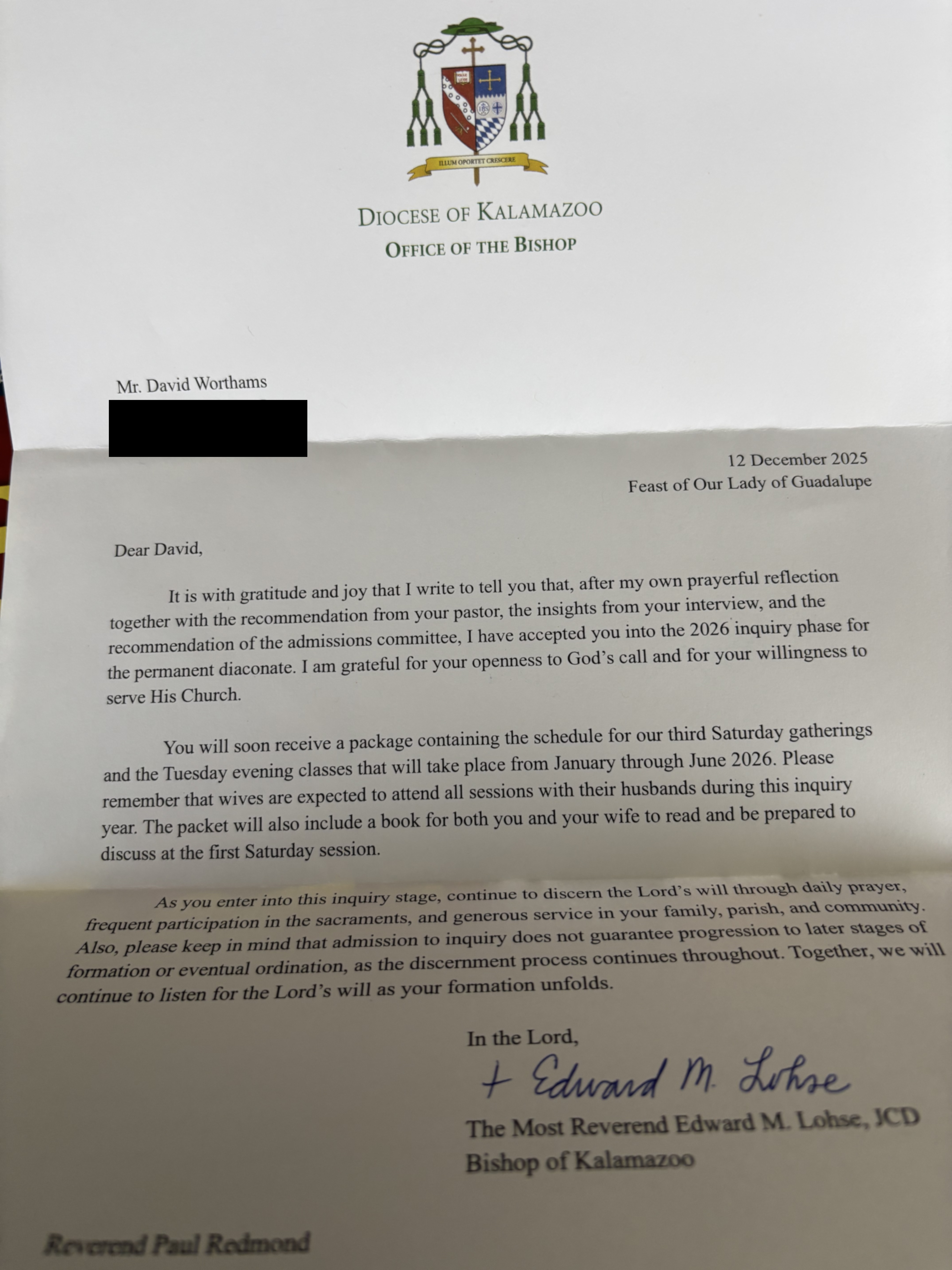 A few days before Christmas ‘25, I received a letter from His Excellency, Edward Lohse, the Bishop of Kalamazoo. His letter marked the conclusion of the initial phase and the start of the next steps of a personal journey that began almost four years ago when, between memories of my Grandma’s voice and of the night I was accepted into the Catholic Church by then Bishop Paul Donovan, and several conversations with folks whose advice I cherish, I decided to inquire about becoming a Permanent Deacon in the Catholic Church. I’m sure that I’ll write about the perfect storm of events, voices, and thoughts that came together somewhere down the road.